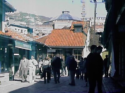 Bas(h)c(h)ars(h)ija, or the old Turksih bazaar with the National Library in the background, Sarajevo |